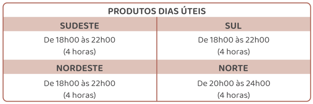 (iv) Produto: Redução de demanda, em determinado local de entrega (subsistema), sendo aplicado em dias úteis e nos horários especificados a seguir, com disponibilidade definida para todo o período de vigência: