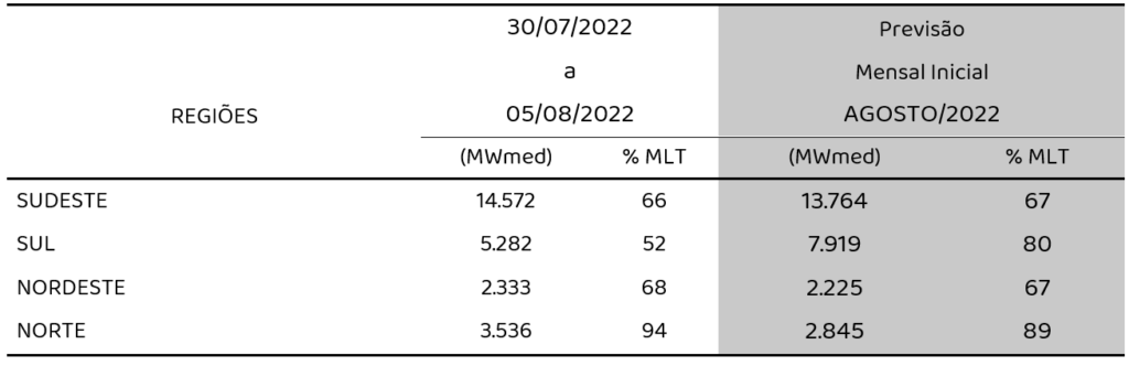 Para agosto de 2022, são previstas as seguintes taxas de crescimento em relação ao mesmo mês do ano anterior: 0,5% para o subsistema SE/CO, 0% para o Sul, -1,1% (decréscimo) para o Nordeste e 5,2% para o Norte. Para os meses de agosto e setembro, a carga do SIN projetada ficou em 68.040 e 69.914 MWmed, um crescimento de 0,6% e de -1,1% (decrescimento) em relação aos mesmos meses de 2021.