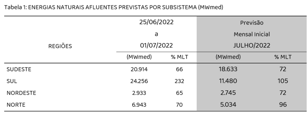 Para julho de 2022, são previstas as seguintes taxas de crescimento em relação ao mesmo mês do ano anterior: 2,4% para o subsistema SE/CO, 1,2% para o Sul, -1,2% (decréscimo) para o Nordeste e 4% para o Norte. Para os meses de julho e agosto, a carga do SIN projetada ficou em 66.561 e 68.151 MWmed, um crescimento de 1,7% e 0,7% em relação aos mesmos meses de 2021.