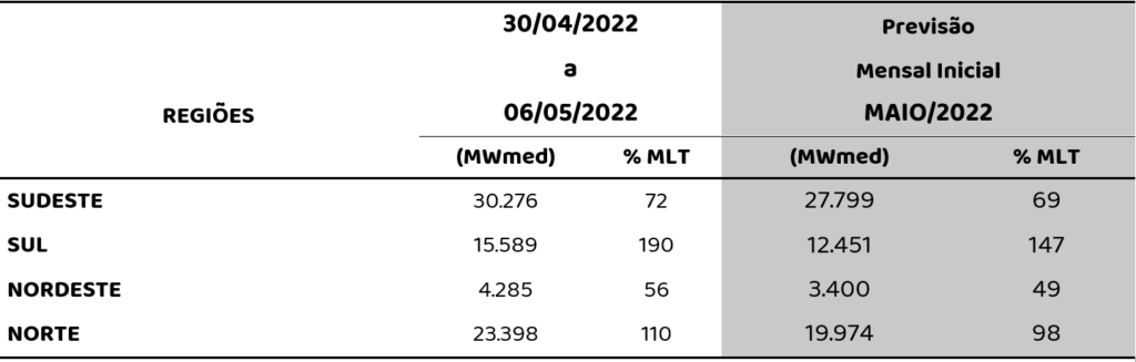 As previsões de ENA mensais indicam as seguintes porcentagens de MLT: 69% para o Sudeste, 147% para o Sul (acima da média), 49% para o Nordeste (metade da média) e 98% para o Norte (na média histórica), conforme apresentado na Tabela 1: