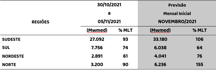 Para a próxima semana operativa, as bacias da região Sudeste/Centro-Oeste permanecem apresentando precipitação próximos à média semanal. Há também precipitação prevista para a região Sul em função de áreas de instabilidade sobre a região, embora inferiores à média semanal. Se forem comparados com as precipitações da última semana de outubro, há recessão das afluências nos subsistemas Sudeste/Centro-Oeste e Sul, porém, há uma ascensão das afluências nos subsistemas Norte e Nordeste. A previsão mensal para o mês de novembro indica afluências acima da média histórica para os subsistemas Sudeste e Norte e abaixo da média histórica para os demais subsistemas.