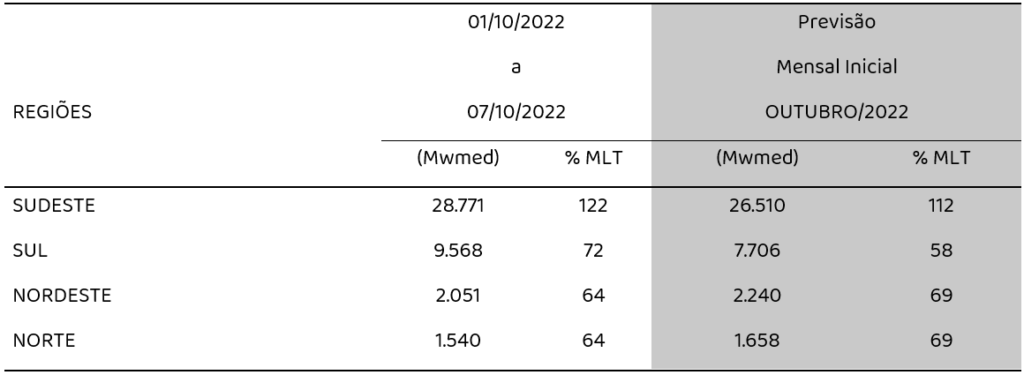 Uma vez que vivenciamos um período de transição para o úmido, muitas bacias apresentam comportamento de recessão das vazões, como as do São Francisco, Paraná, Iguaçu e Uruguai. A bacia do Paraguai apresenta manutenção das vazões e as bacias do Madeira e Xingu apresentam elevação de vazões. As previsões de ENA mensais indicam as seguintes porcentagens de MLT: 112% para o Sudeste, 58% para o Sul, 69% para o Nordeste e 69% para o Norte, conforme apresentado na Tabela 1:
