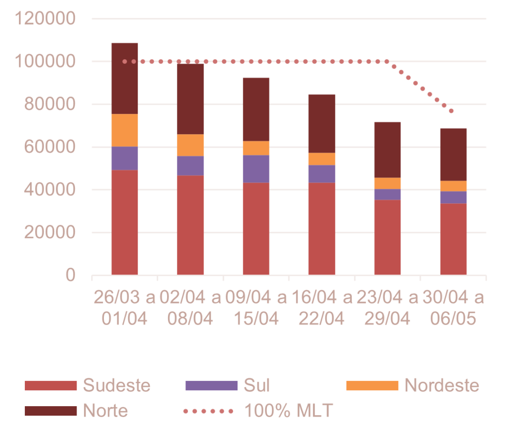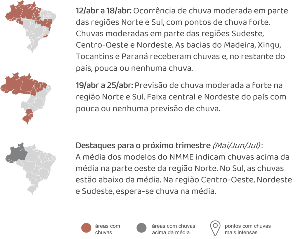 Analisando a previsão semanal da ENA na RV3 de abril do ONS (13/abr), verifica-se uma tendência de redução da ENA ao longo das semanas, atingindo 69 GWmed na semana de 30 de abril a 06 de maio.