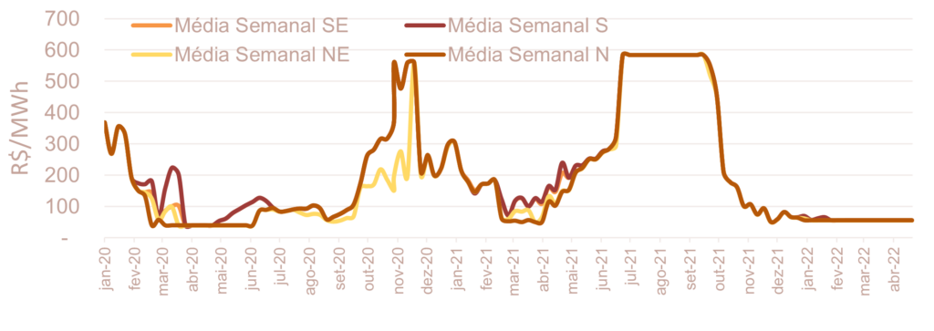 A previsão do preço para a semana de 23/04 a 29/04 não apresentou variação relevante em todos os submercados, em relação à média semanal do PLD da semana de 16/04 a 22/04.