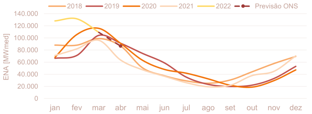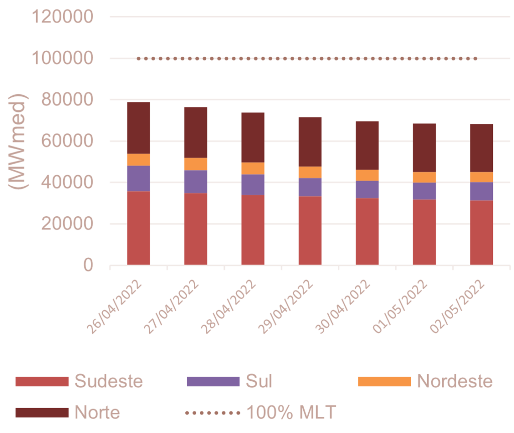 Para abril de 2022, espera-se que as afluências fechem em torno de 86% da MLT para o sistema.