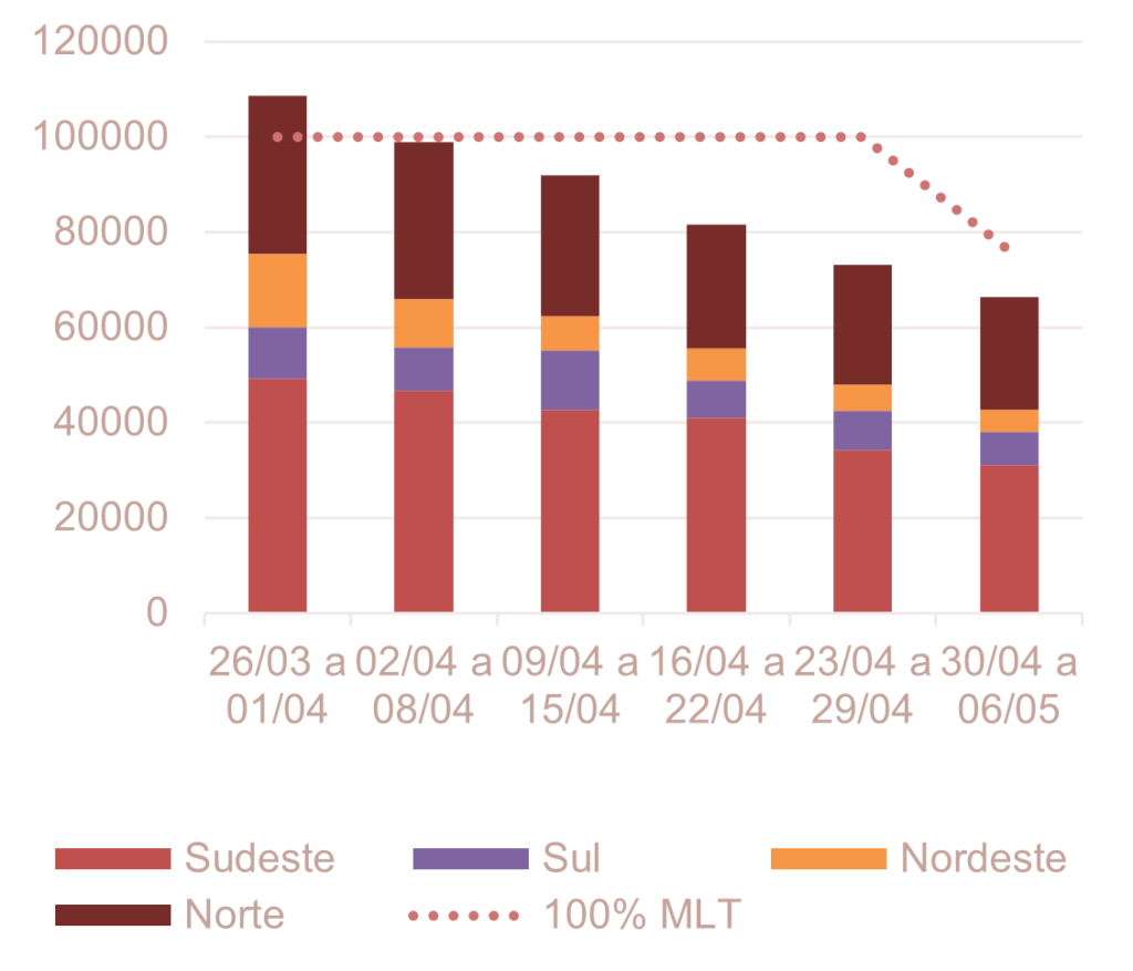 Analisando a previsão semanal da ENA na RV4 de abril do ONS (19/abr), verifica-se uma tendência de redução da ENA ao longo das semanas, atingindo 66 GWmed na semana de 30 de abril a 06 de maio.