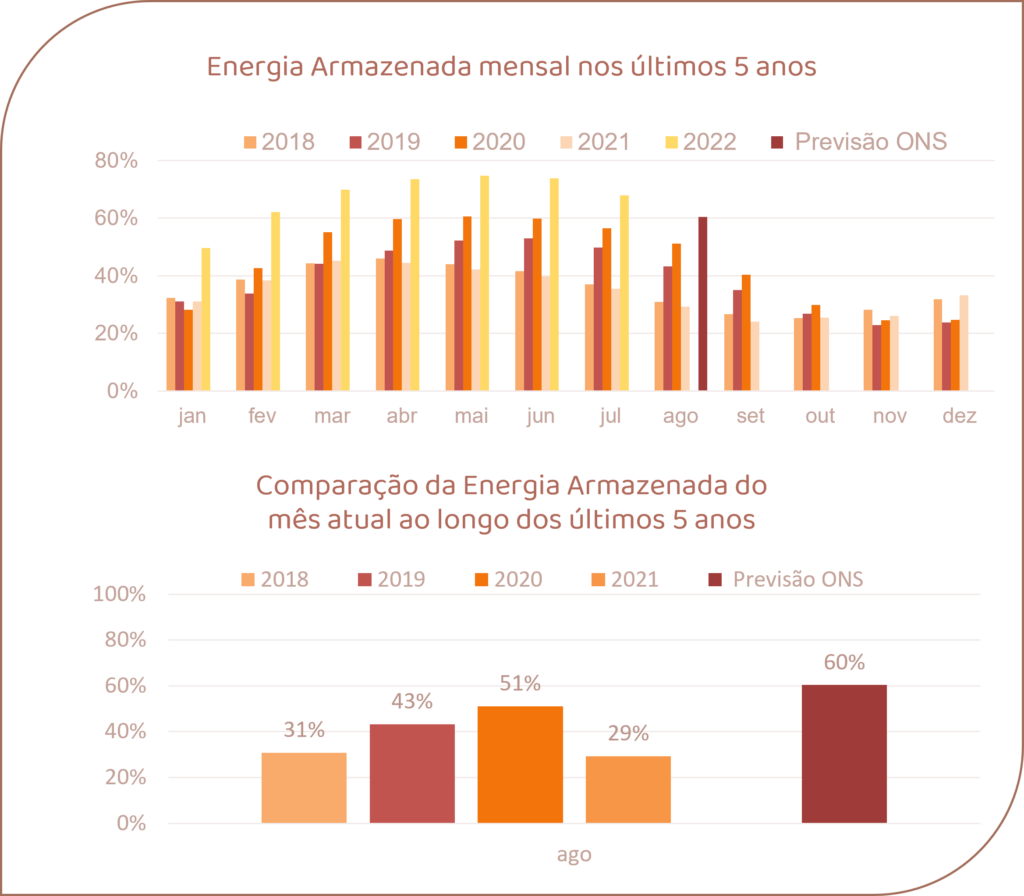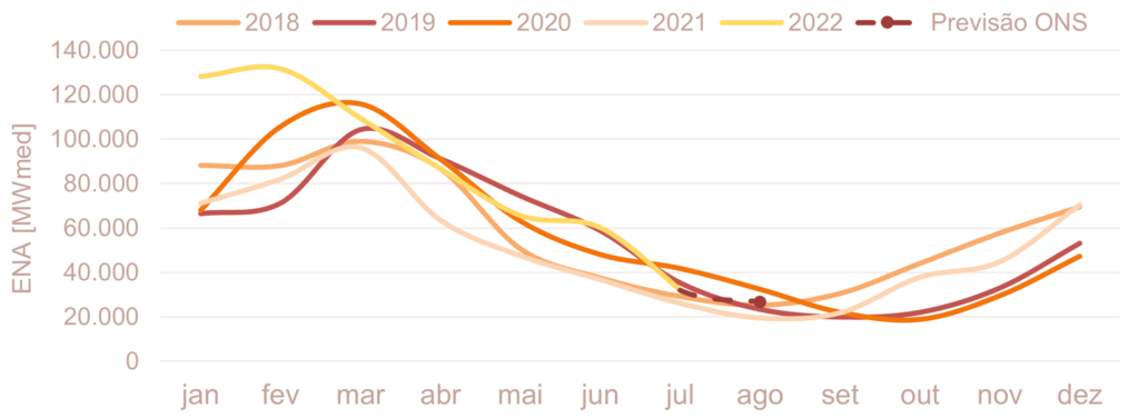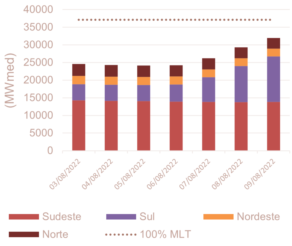 Para agosto de 2022, espera-se que as afluências fechem em torno de 72% da MLT para o sistema.