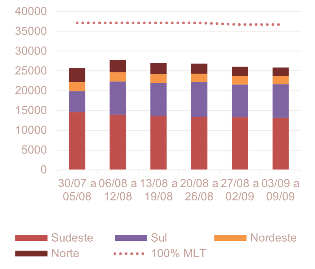Analisando a previsão semanal da ENA na RV0 de agosto do ONS (28/jul), verifica-se uma tendência de estabilidade no volume de ENA ao longo das semanas, atingindo cerca de 26 GWmed na semana de 03 de setembro a 09 de setembro.