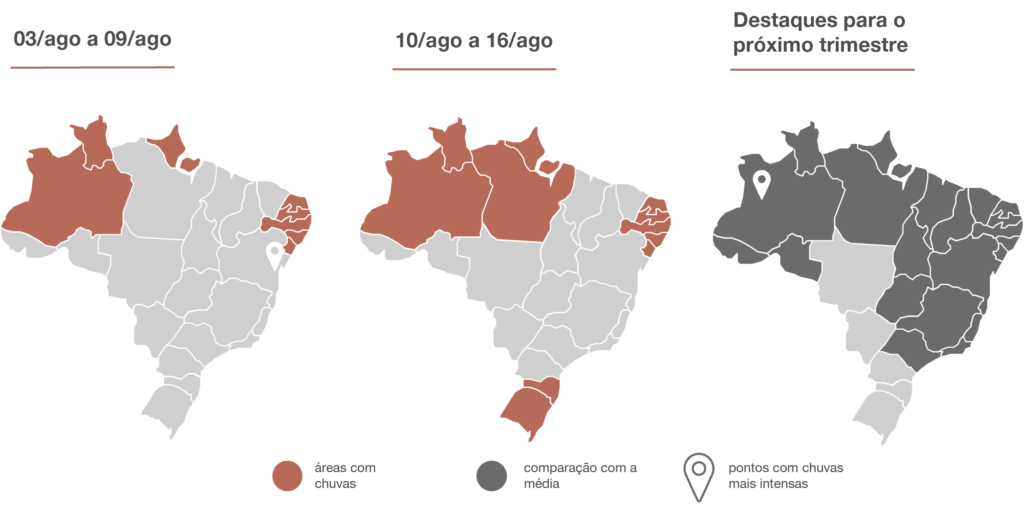 - 03/ago a 09/ago: Chuva fraca no extremo norte do país e no litoral Nordeste.