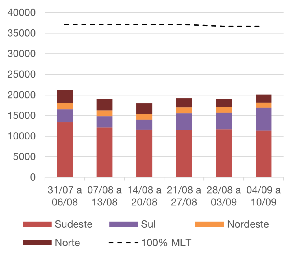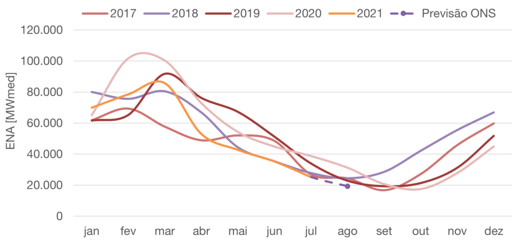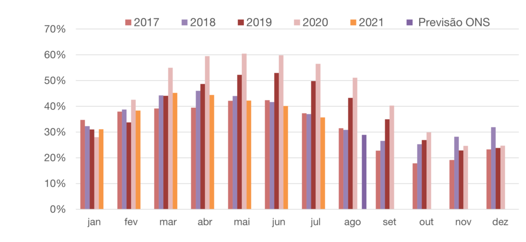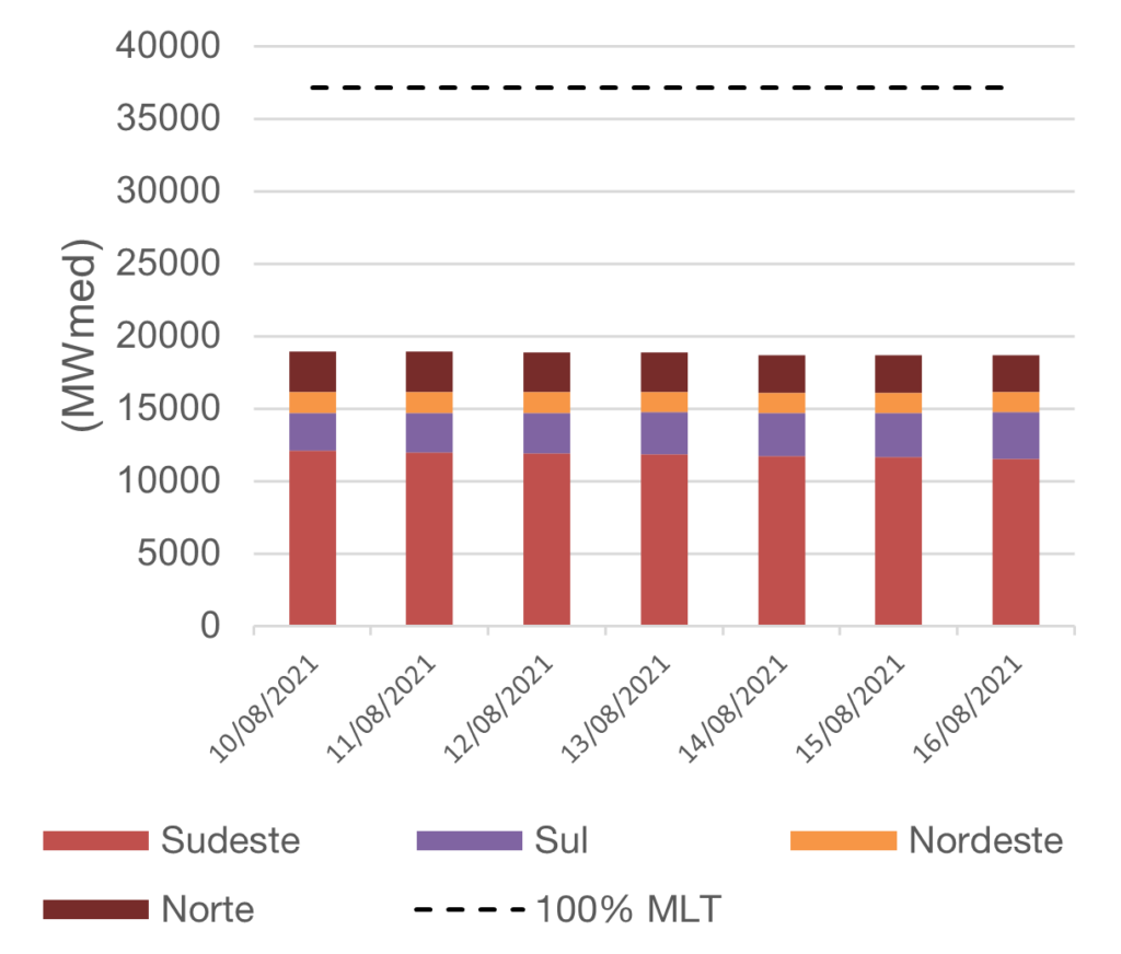 - Para agosto de 2021, espera-se que as afluências fechem em torno de 52% da MLT para o sistema.