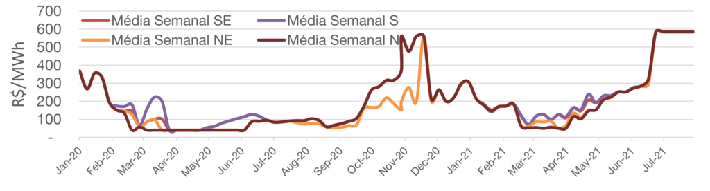 Aumento do preço semanal estimado pelo Decomp em todos os submercados por conta da redução nos níveis de afluências esperadas, baixos níveis de armazenamento e flexibilização das vazões das usinas.