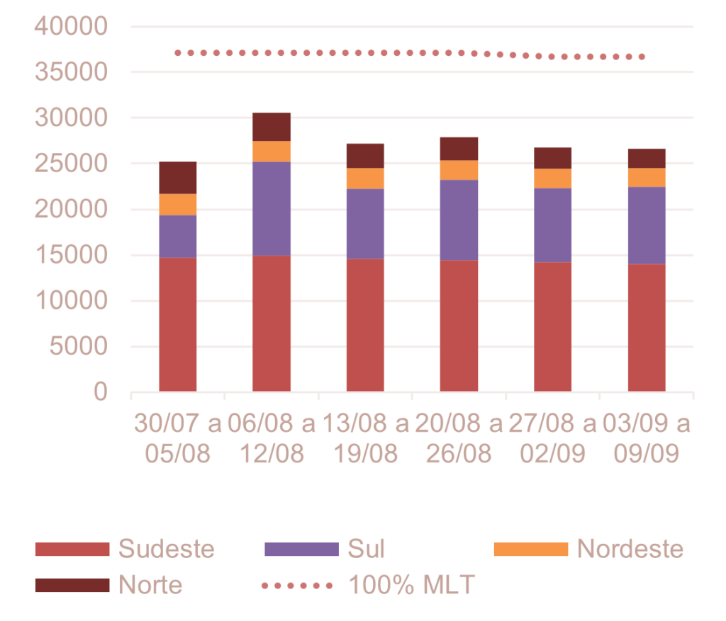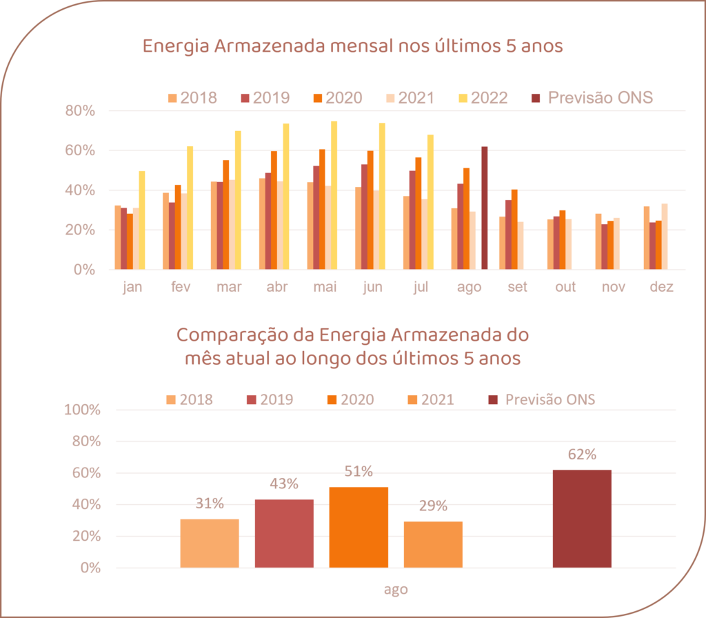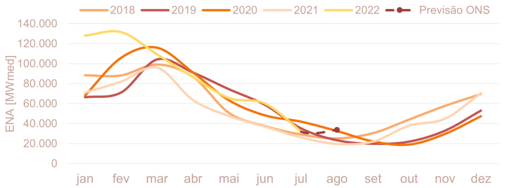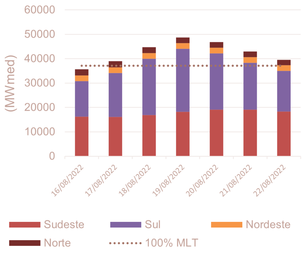 Para agosto de 2022, espera-se que as afluências fechem em torno de 91% da MLT para o sistema.