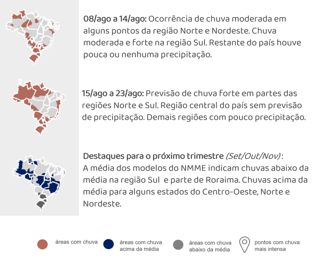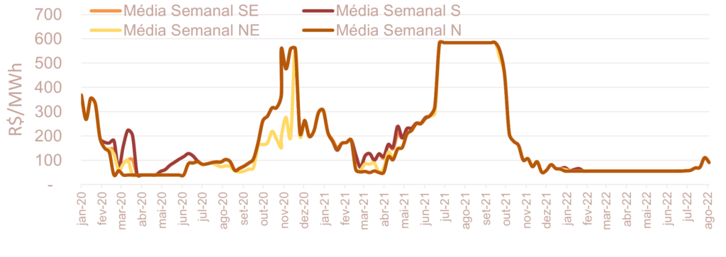 A previsão do preço para a semana de 13/08 a 19/08 apresentou redução de R$20/MWh para todos os submercados em relação à média semanal do PLD da semana de 06/08 a 12/08.