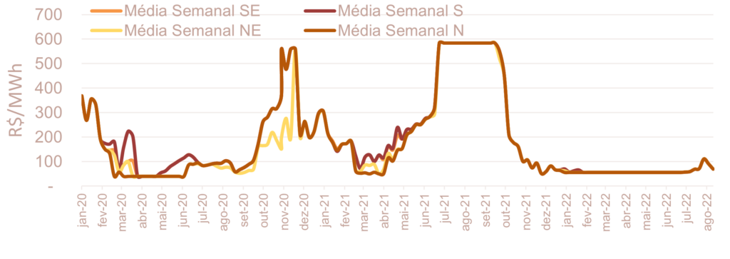 A previsão do preço para a semana de 20/08 a 26/08 apresentou redução de R$17/MWh para todos os submercados em relação à média semanal do PLD da semana de 13/08 a 19/08.
