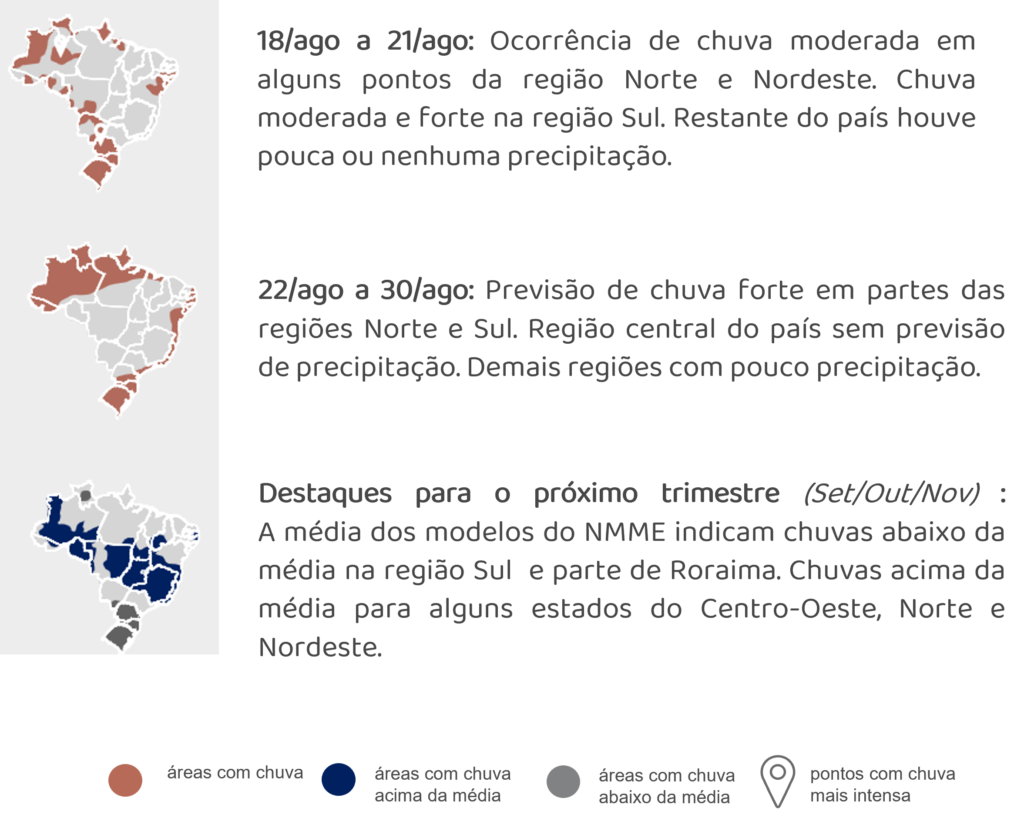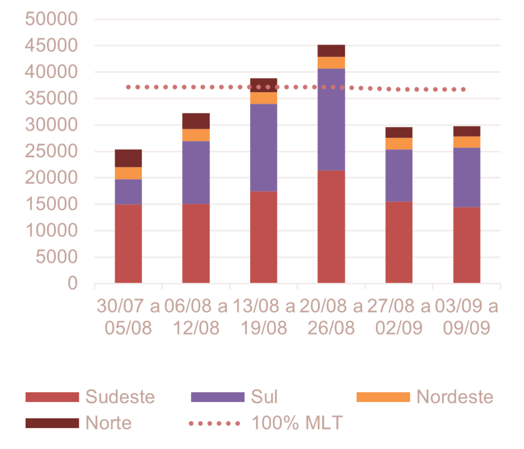 Analisando a revisão da previsão semanal da ENA de agosto (18/ago), verifica-se uma tendência de aumento no volume de ENA ao longo das semanas, atingindo cerca de 30 GWmed na semana de 03 de setembro a 09 de setembro.