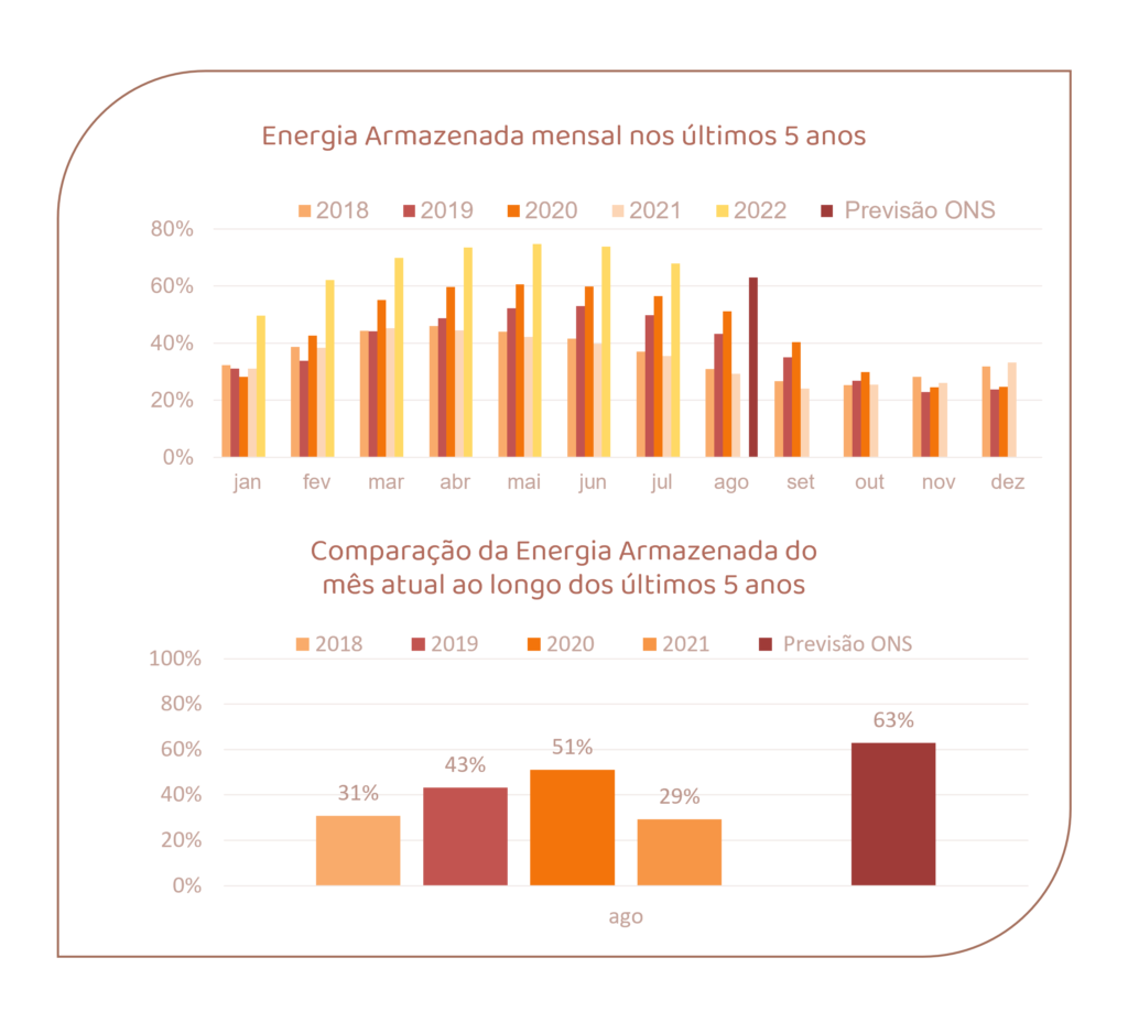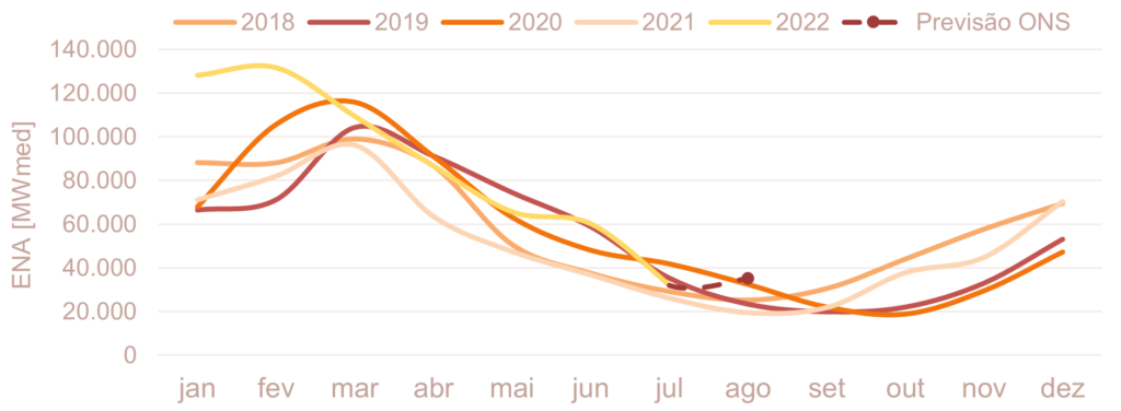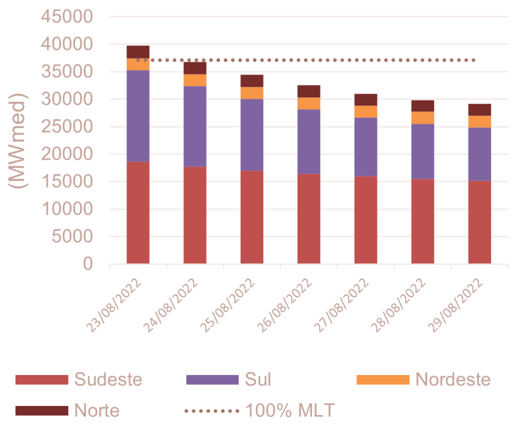 Para agosto de 2022, espera-se que as afluências fechem em torno de 95% da MLT para o sistema.
