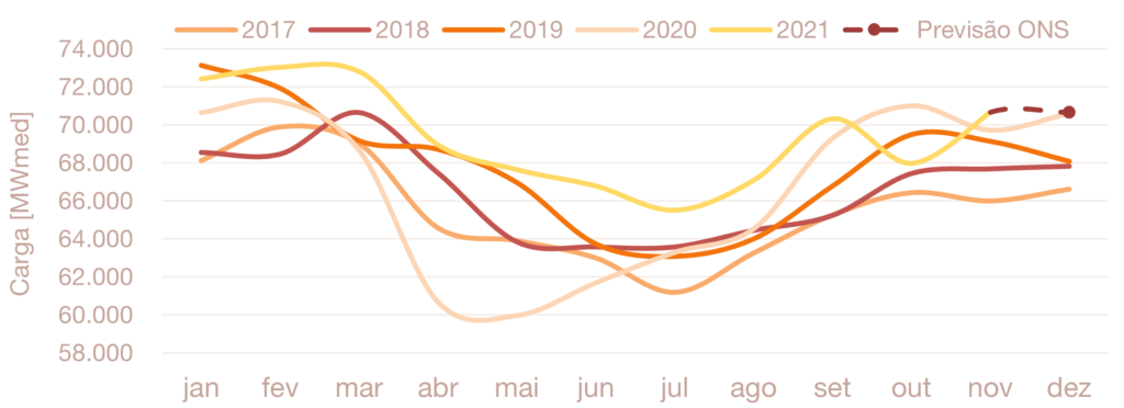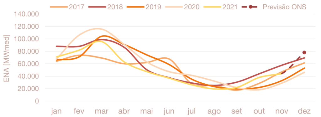 Na previsão de ENA diária para o Dessem, feita pelo ONS em 29 de novembro, verifica-se uma tendência de leve crescimento da ENA até o dia 6 de novembro, mantendo-se em cerca de 57,5 GWmed nesse mesmo dia.