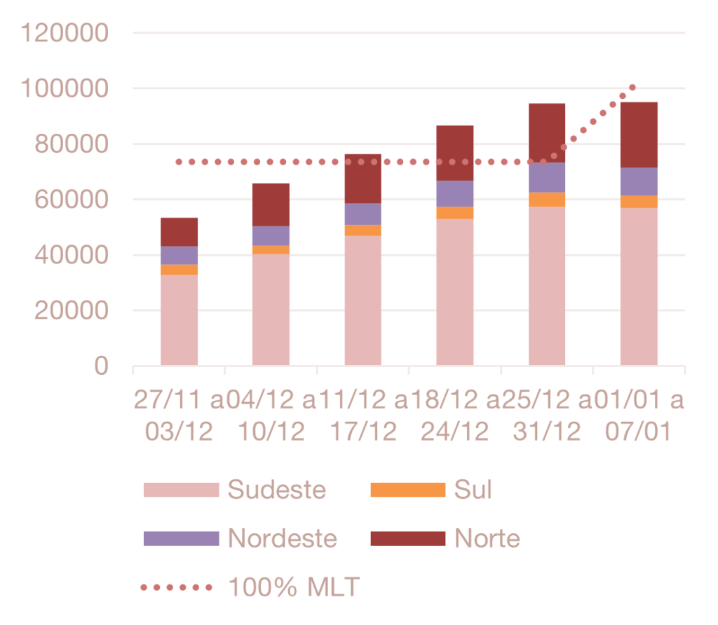 Analisando a previsão semanal da ENA na RV0 de dezembro do ONS (25/nov), verifica-se uma elevação significativa da ENA até a semana de 25 a 31 de dezembro, atingindo 95 GWmed no SIN.