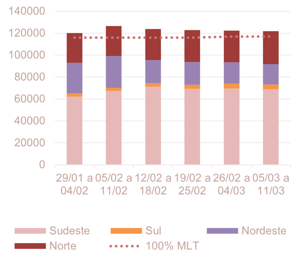 Analisando a previsão semanal da ENA na RV0 de fevereiro do ONS (27/jan), verifica-se uma variação da ENA ao longo das semanas, atingindo 121 GWmed na semana de 05 a 11 de março.