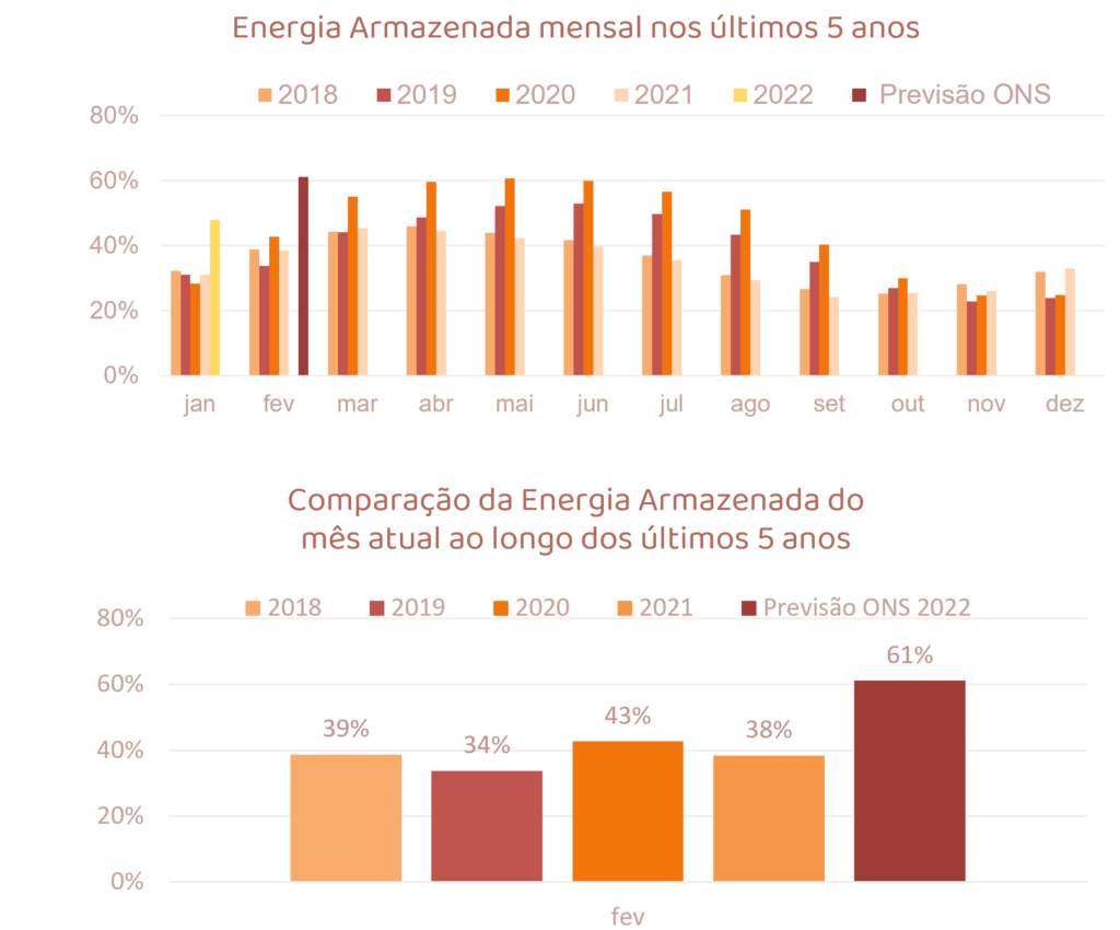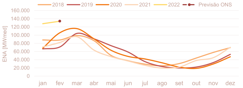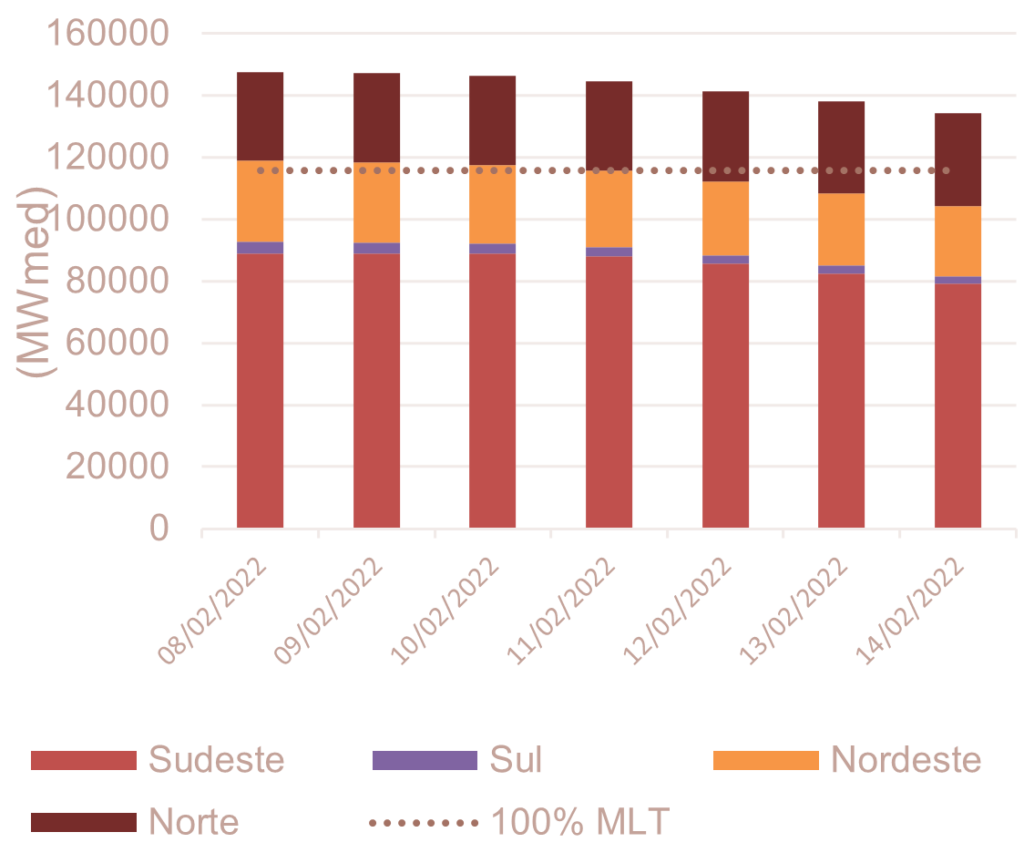 Para fevereiro de 2022, espera-se que as afluências fechem em torno de 116% da MLT para o sistema.