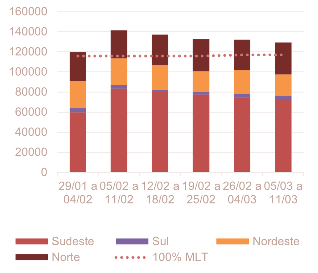 Analisando a previsão semanal da ENA na RV1 de fevereiro do ONS (03/fev), verifica-se uma variação da ENA ao longo das semanas, atingindo 129 GWmed na semana de 05 a 11 de março.