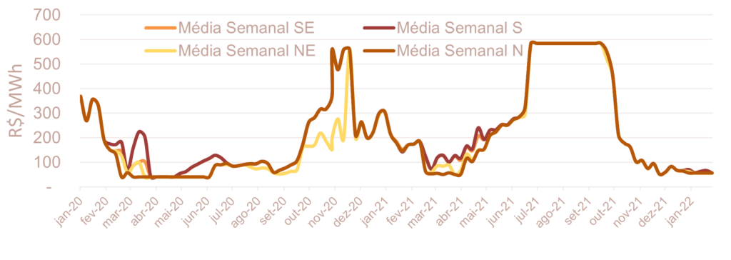A previsão do preço para a semana de 05/02 a 11/02 não apresentou variação relevante em todos os submercados em relação à média semanal do PLD da semana de 29/01 a 04/02.