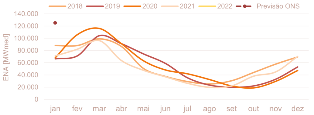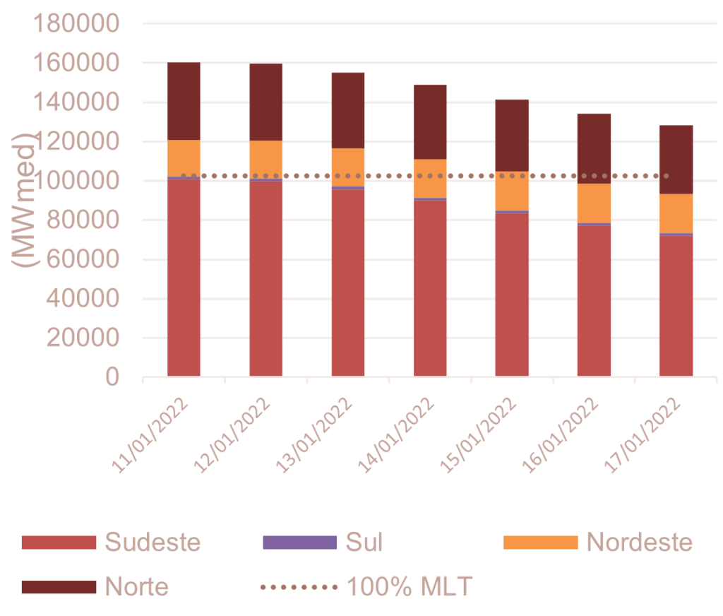 Para janeiro de 2022, espera-se que as afluências fechem em torno de 122% da MLT para o sistema.