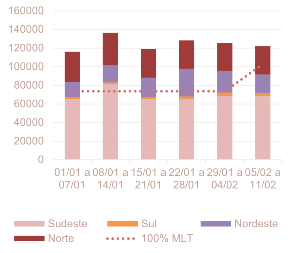 Analisando a previsão semanal da ENA na RV1 de janeiro do ONS (06/jan), verifica-se uma variação da ENA ao longo das semanas, atingindo 122 GWmed na semana de 05 a 11 de fevereiro.