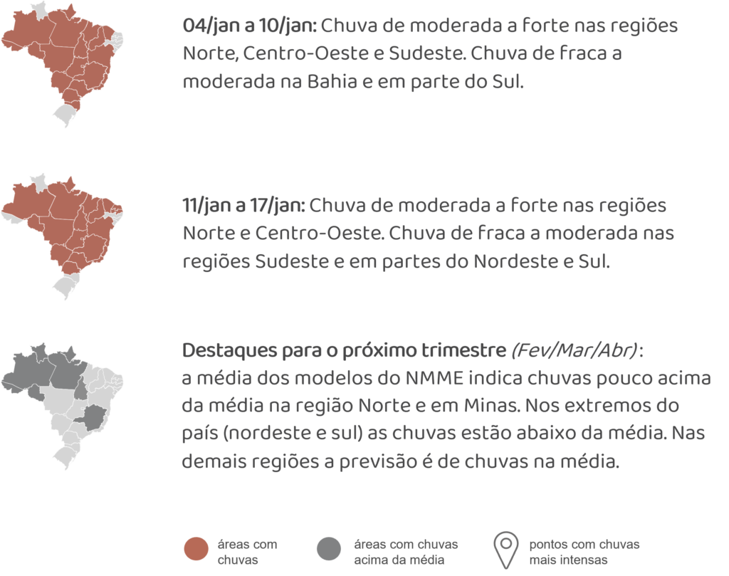 Entre os destaques dessa semana, temos a ocorrência de grandes volumes de chuva de Norte a Sudeste, decorrentes da combinação de fenômenos como o La Niña e a ZCAS. Apesar de ajudarem a recuperar os reservatórios, as chuvas têm sido responsáveis por tragédias em diversos municípios, principalmente na Bahia e em Minas Gerais. O Sul do país, em contrapartida, permanece com clima seco e pouca precipitação.
