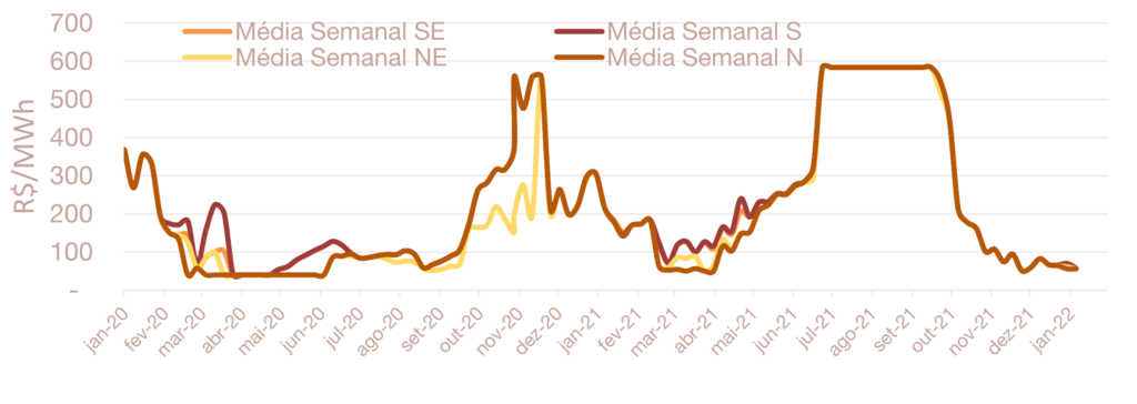 A previsão do preço para a semana de 15/01 a 21/01 apresentou um pequeno aumento nos submercados SE, S e NE em relação à média semanal do PLD da semana de 08/01 a 14/01.