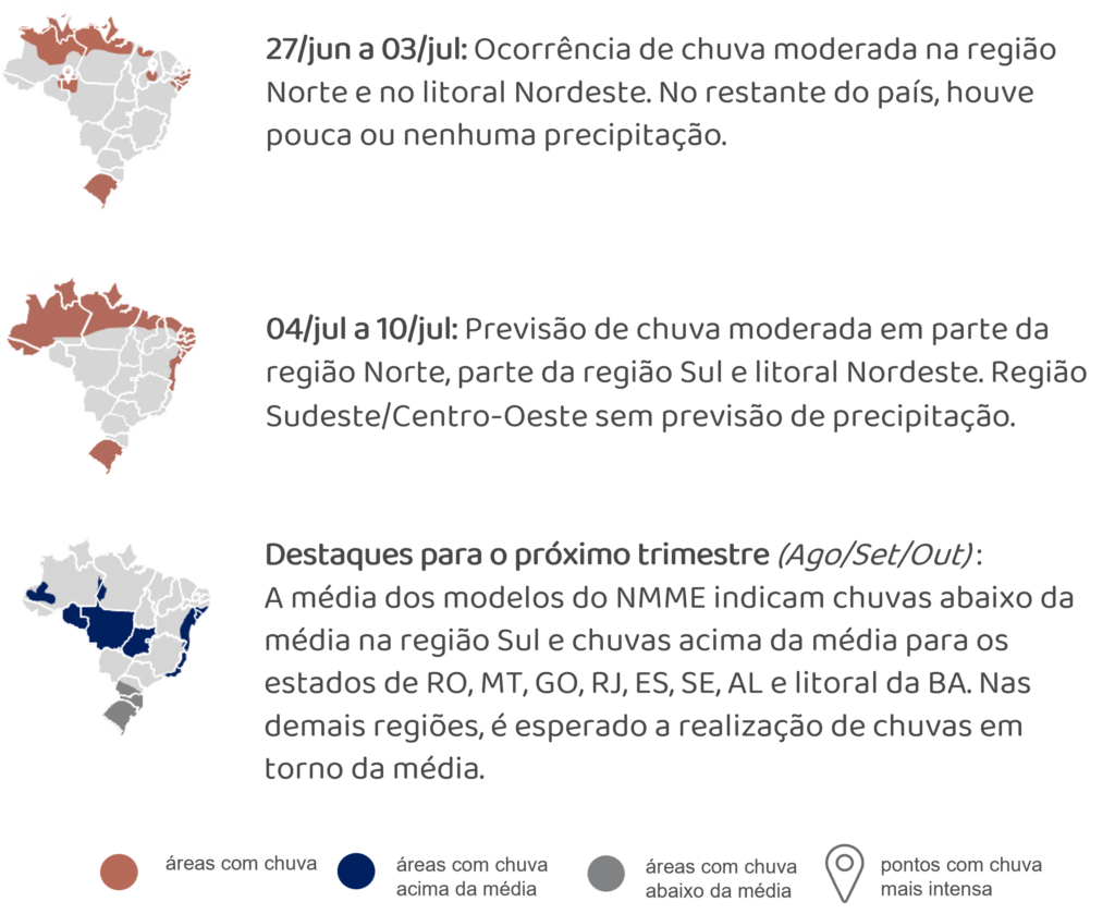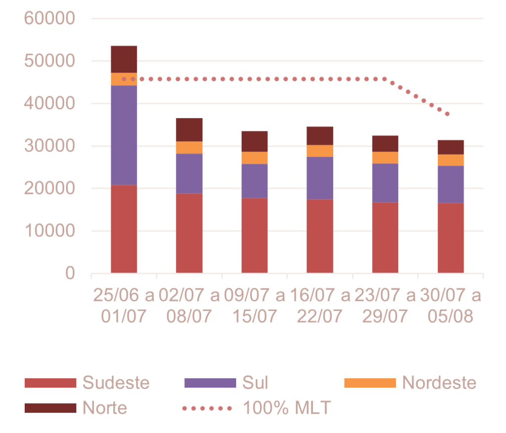 Analisando a previsão semanal da ENA na RV1 de julho do ONS (30/jun), verifica-se uma tendência de redução da ENA ao longo das semanas, atingindo cerca de 31 GWmed na semana de 30 de julho a 05 de agosto.