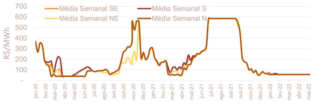 A previsão do preço para a semana de 07/05 a 13/05 não apresentou variação relevante em todos os submercados, em relação à média semanal do PLD da semana de 30/04 a 06/05 .