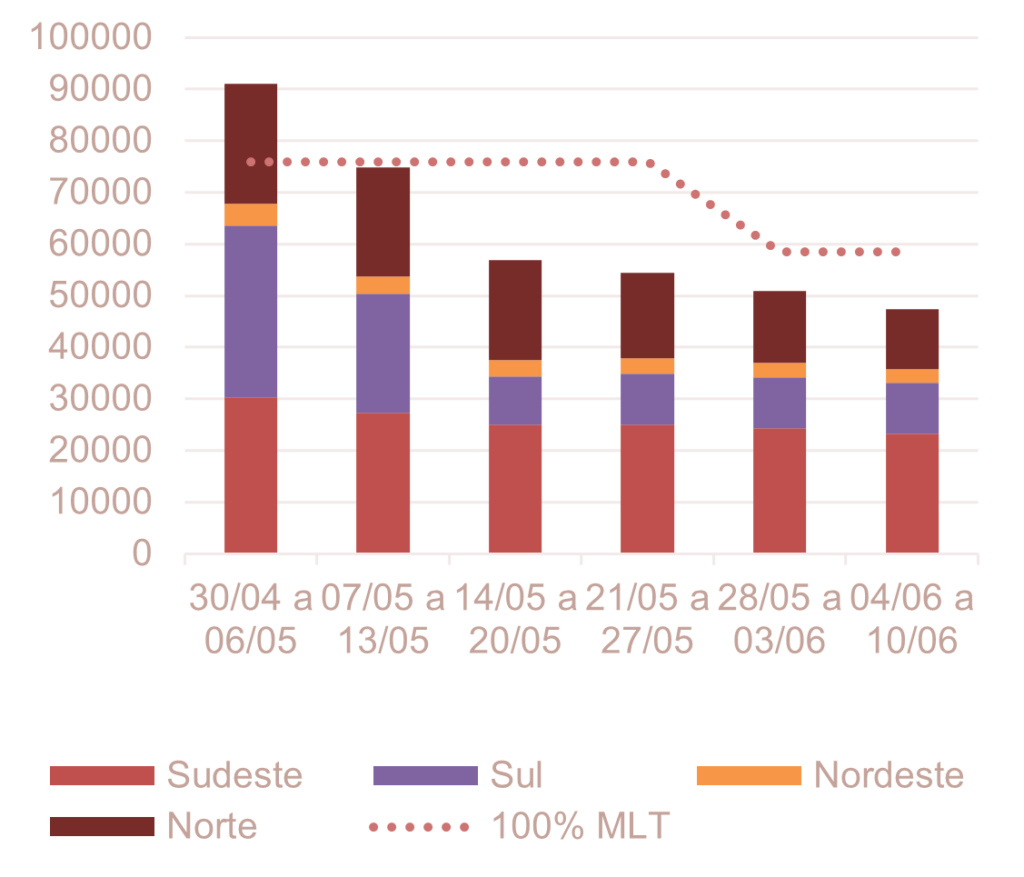 Analisando a previsão semanal da ENA na RV1 de maio do ONS (05/mai), verifica-se uma tendência de redução da ENA ao longo das semanas, atingindo 47 GWmed na semana de 04 de junho a 10 de junho.