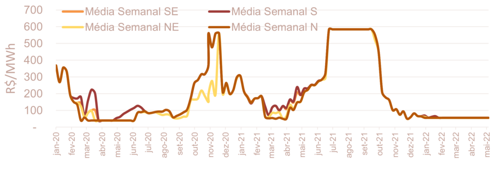 A previsão do preço para a semana de 14/05 a 20/05 não apresentou variação relevante em todos os submercados, em relação à média semanal do PLD da semana de 07/05 a 13/05 .