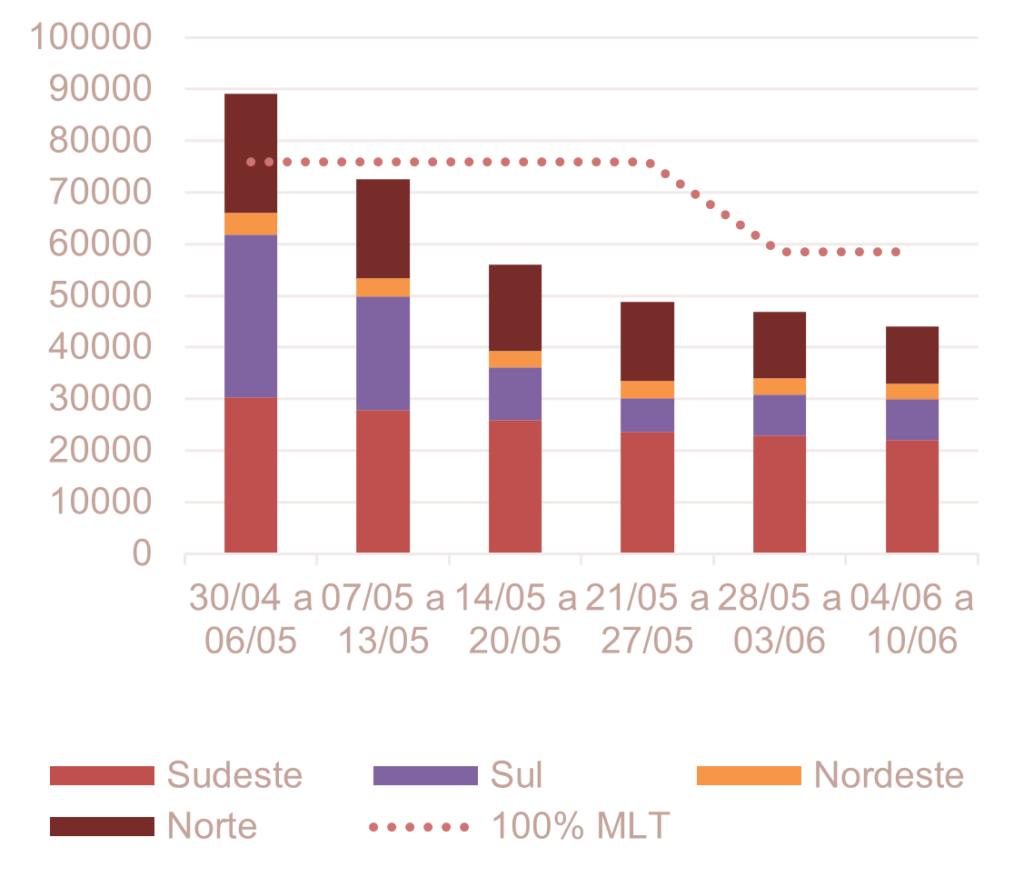 Analisando a previsão semanal da ENA na RV2 de maio do ONS (12/mai), verifica-se uma tendência de redução da ENA ao longo das semanas, atingindo 44 GWmed na semana de 04 de junho a 10 de junho.