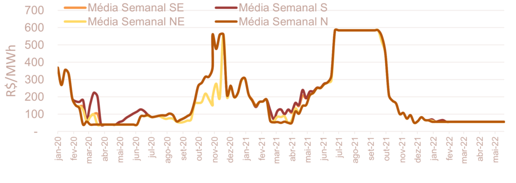 A previsão do preço para a semana de 28/05 a 03/06 não apresentou variação relevante em todos os submercados em relação à média semanal do PLD da semana de 21/05 a 27/05.