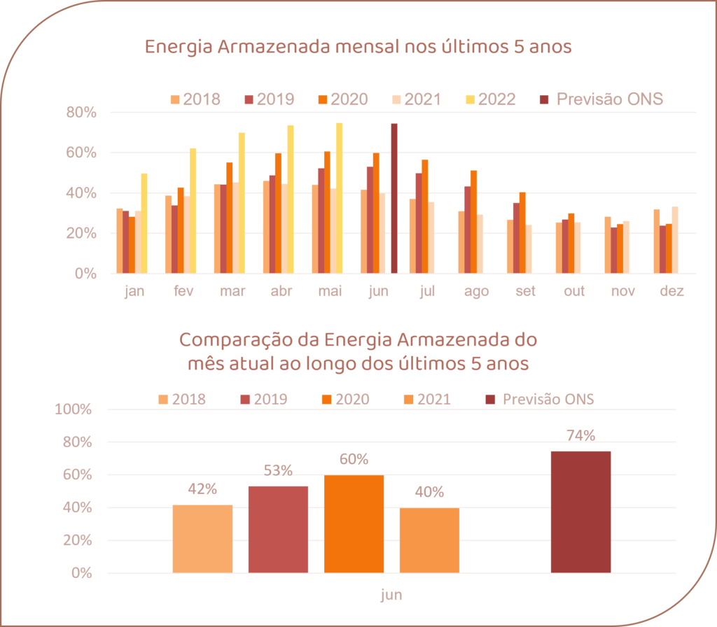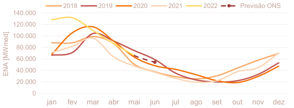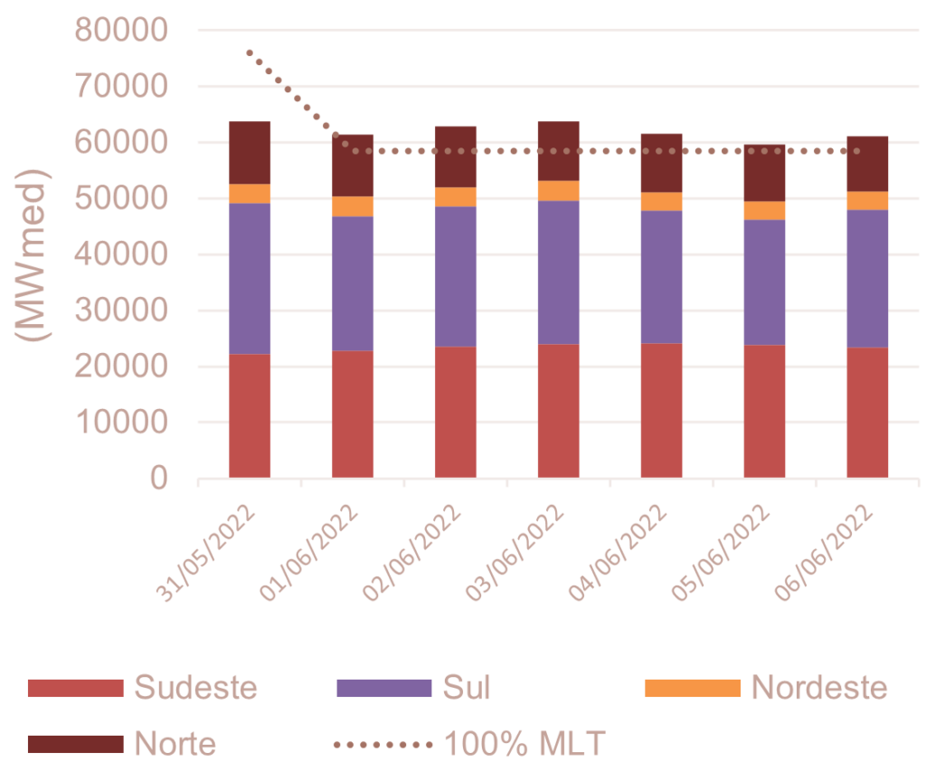 Para junho de 2022, espera-se que as afluências fechem em torno de 93% da MLT para o sistema.