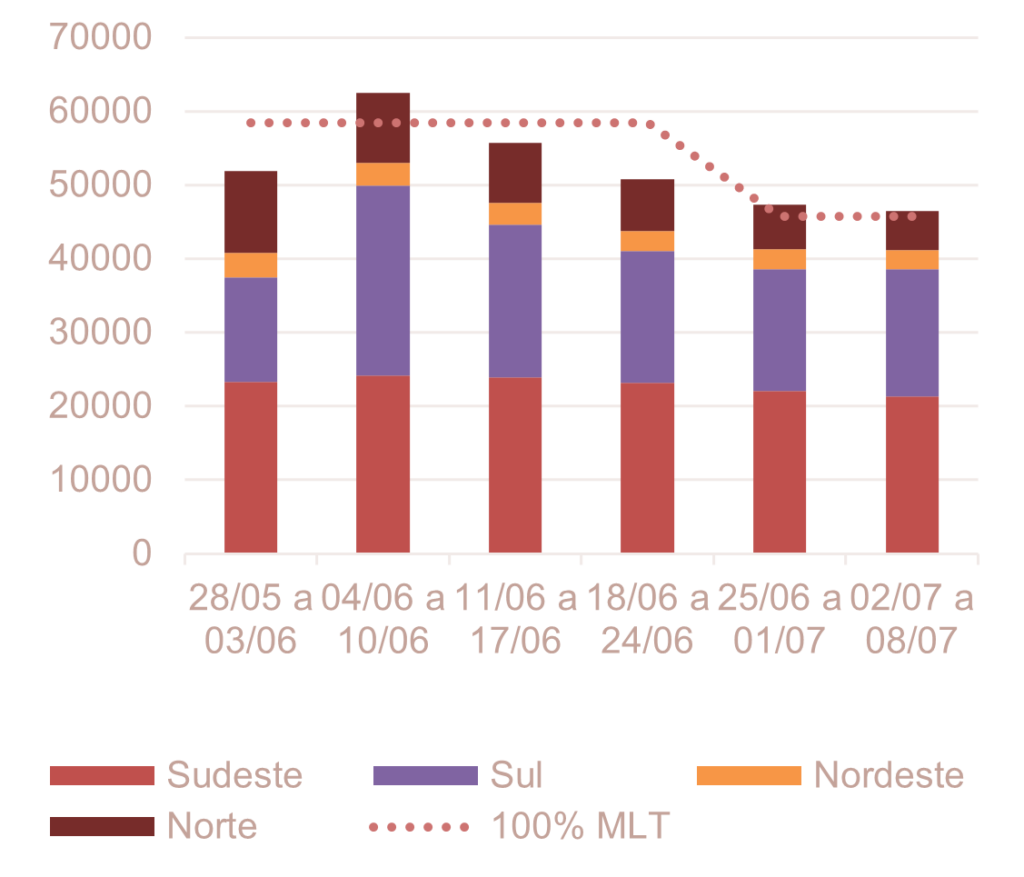Analisando a previsão semanal da ENA na RV0 de junho do ONS (26/mai), verifica-se uma tendência de redução da ENA ao longo das semanas, atingindo 46 GWmed na semana de 02 de julho a 08 de julho.
