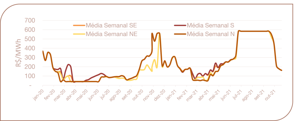 A previsão do preço semanal (Decomp) para a semana de 30/10 a 05/11 apresentou a redução média de R$65/MWh em relação à média semanal do PLD da última semana (Dessem).
