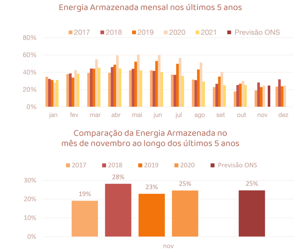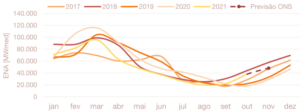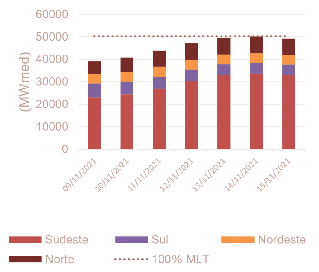 Para novembro de 2021, espera-se que as afluências fechem em torno de 96% da MLT para o sistema.