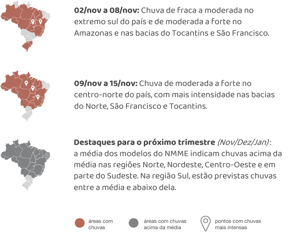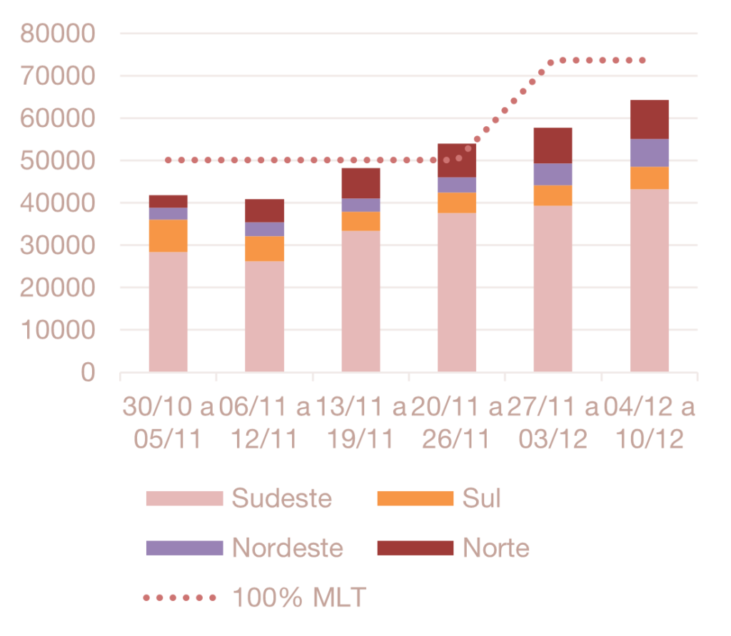 Analisando a previsão semanal da ENA na RV1 de novembro do ONS (04/nov), verifica-se uma elevação significativa da ENA até a semana de 04 a 10 de dezembro, atingindo 64,3 GWmed no SIN