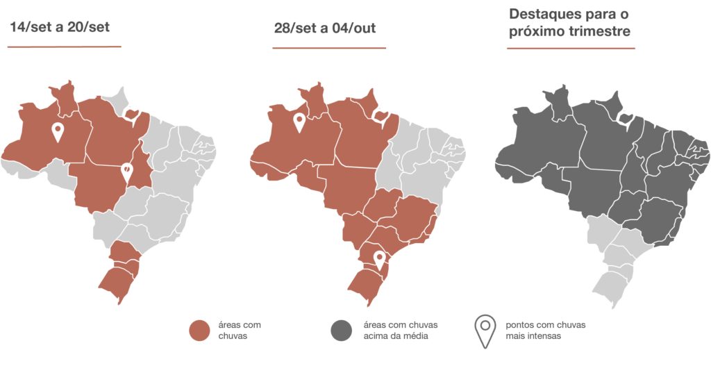 • 28/set a 04/out: Chuva de fraca a moderada na região Norte, em parte do Centro-Oeste e no Sudeste. No Sul a previsão é de chuva moderada a forte.