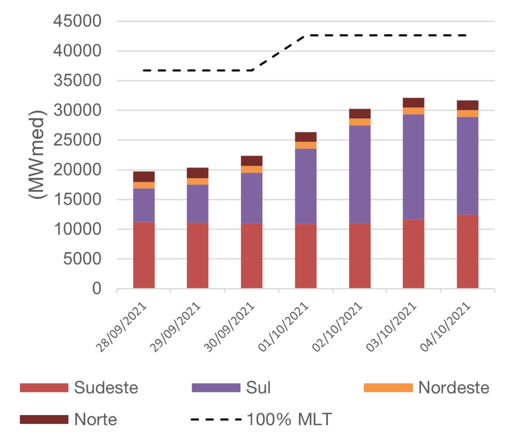 Para outubro de 2021, espera-se que as afluências fechem em torno de 68% da MLT para o sistema.