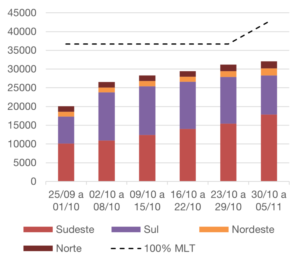 Analisando a previsão semanal da ENA na RV0 de outubro do ONS (23/set), verifica-se uma elevação significativa da ENA ao longo das semanas, superando a marca dos 32GW na semana operativa entre 30/10 a 05/11.