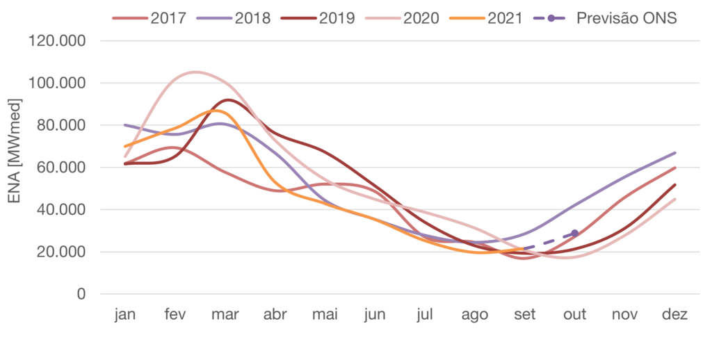 Na previsão de ENA diária para o Dessem, feita pelo ONS em 27 de setembro, verifica-se uma tendência de forte subida da ENA até o dia 04 de outubro, chegando a cerca de 31,5 GWmed no mesmo dia.