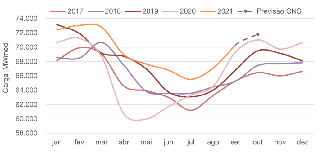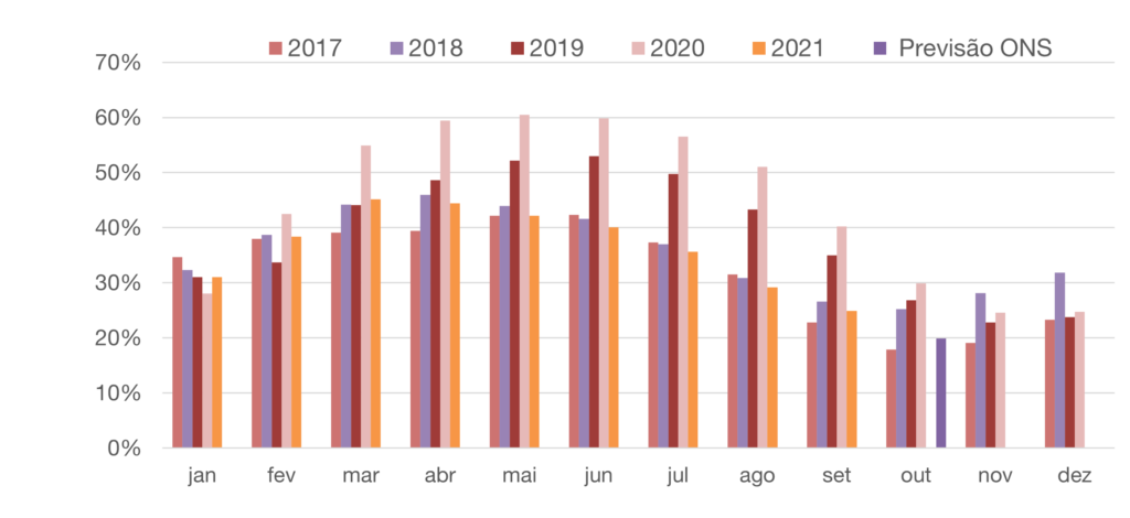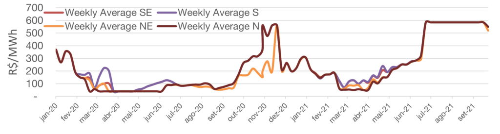 Redução do PLD em todos os submercados por conta principalmente da melhora nas afluências. Para outubro de 2021, espera-se que as afluências fechem em torno de 79% da MLT para o sistema.
