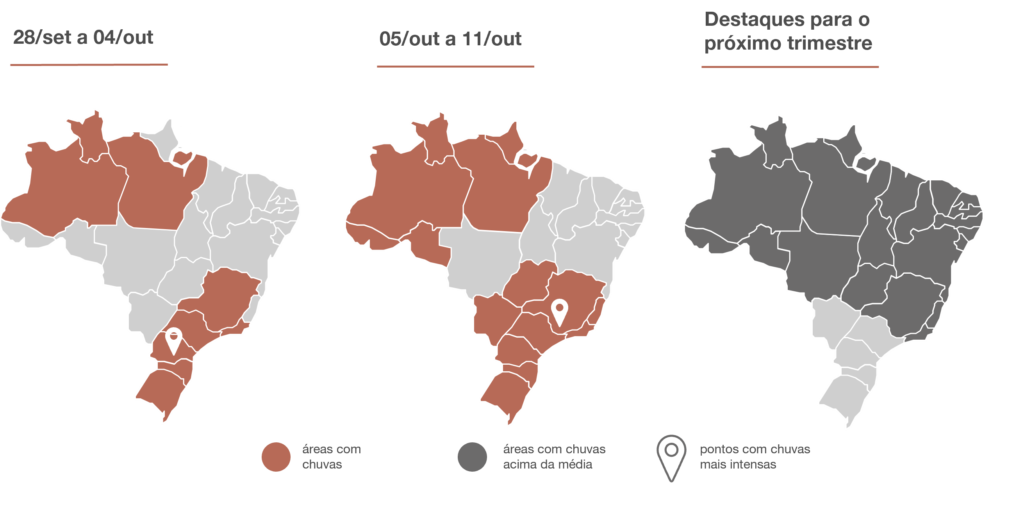 - 05/out a 11/out: Chuva de fraca a moderada na região Norte. Chuva de moderada a forte entre as regiões Centro-Oeste, Sudeste e Sul.