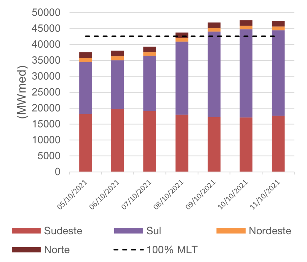 Na previsão de ENA diária para o Dessem, feita pelo ONS em 04 de outubro, verifica-se uma tendência de forte subida da ENA até o dia 11 de outubro, atingindo cerca de 47,5 GWmed no mesmo dia, superando a marca dos 100% da MLT, o equivalente a aproximadamente 42,6 GWmed.