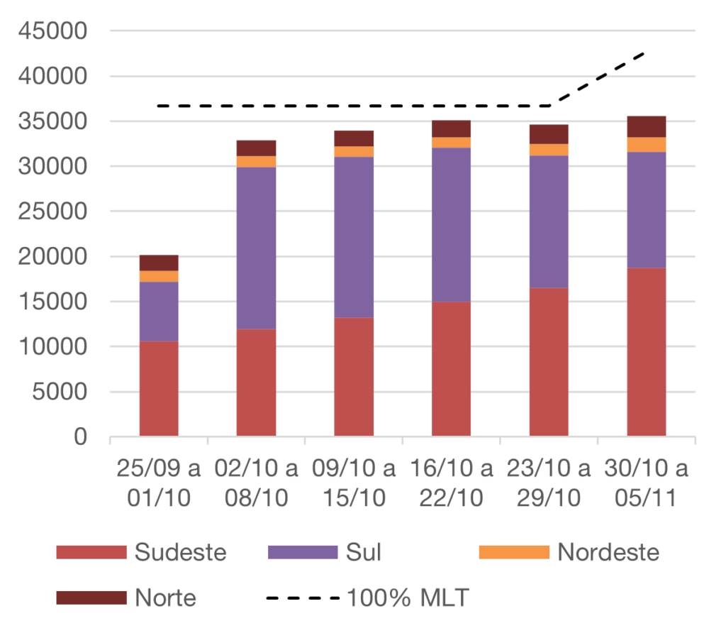 Analisando a previsão semanal da ENA na RV1 de outubro do ONS (30/set), verifica-se uma elevação consistente da ENA ao longo das semanas, superando a marca dos 35,5 GWmed na semana operativa entre 30/10 e 05/11.