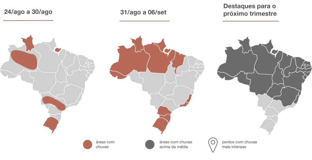 - 31/ago a 06/set: Chuva de fraca a média na região Norte, no Maranhão, litoral Sudeste e no Sul.